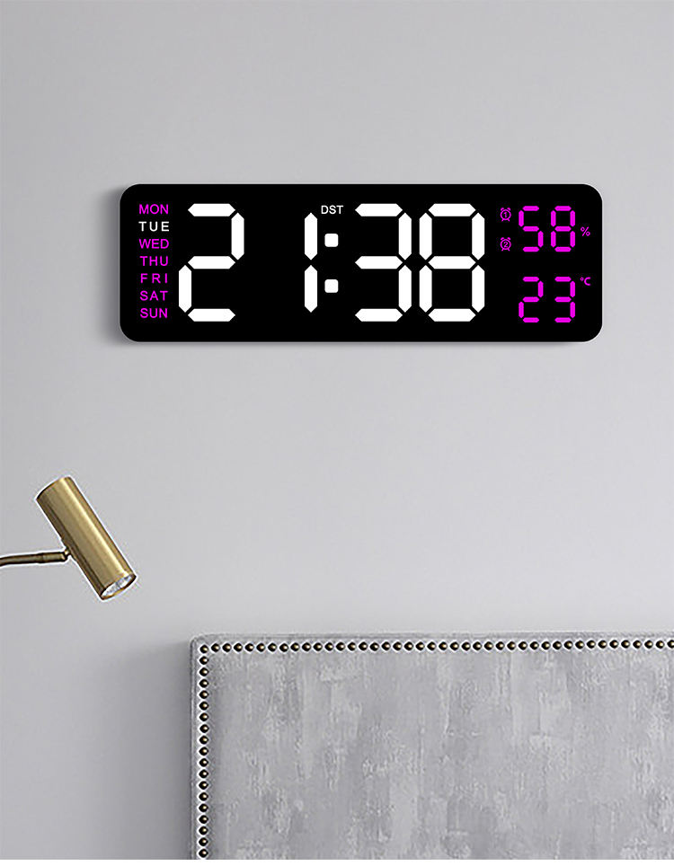 Reloj de pared digital con pantalla LED y brillo ajustable, con alarma y temporizador, ideal para decoración del hogar y la oficina.