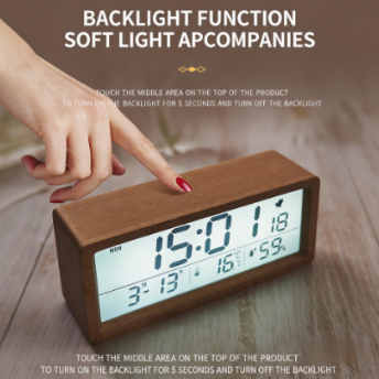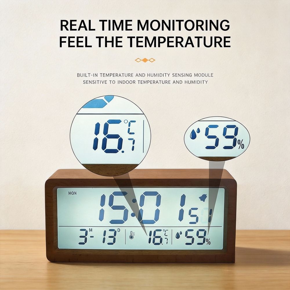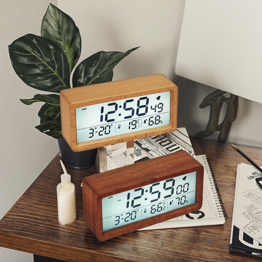 New Modern Solid Wood Large Screen LCD Digital Alarm Clock Backlight Temperature Humidity Electronic Movement Bedside Clock